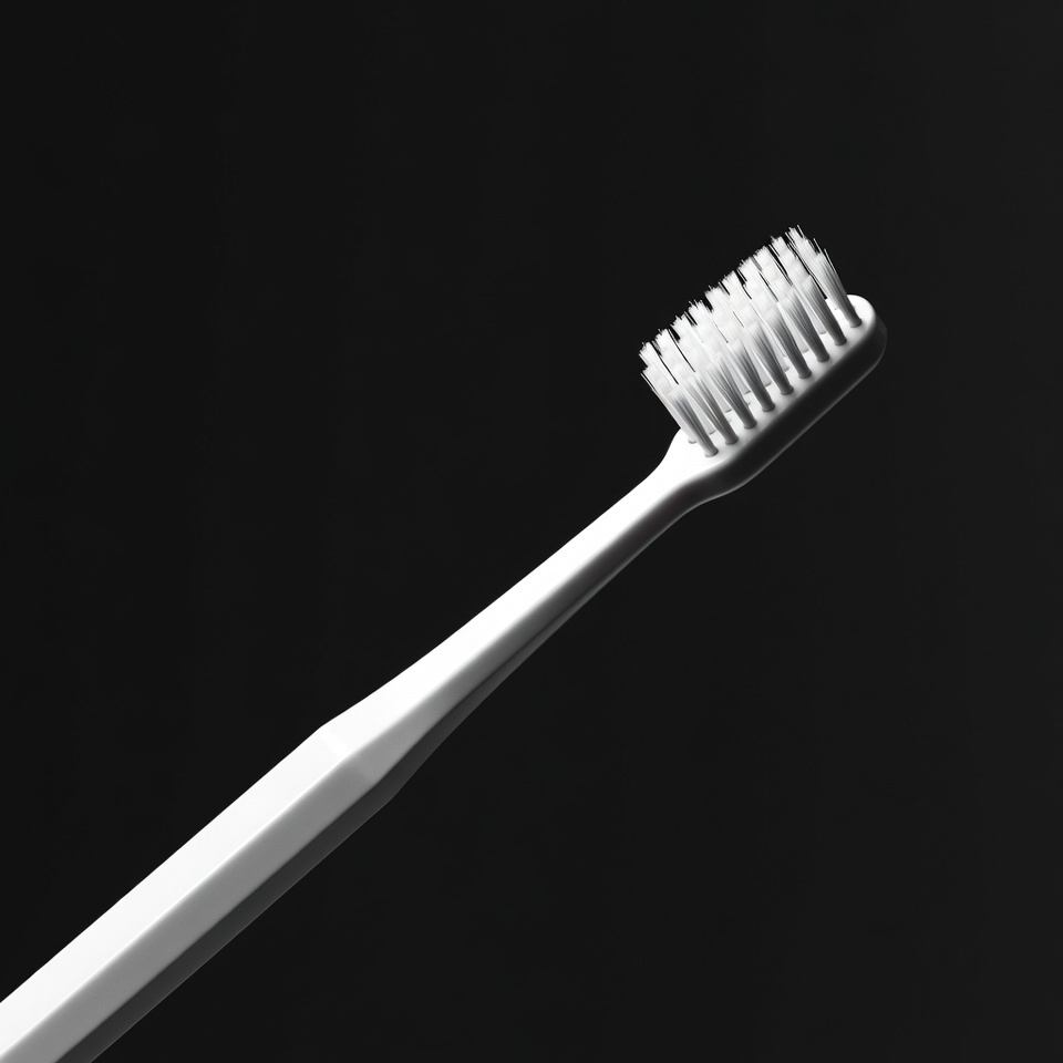 A white plastic toothbrush with soft bristles is angled against a solid black background. The handle is long and ergonomic, and the bristles are densely packed and slightly flared. The image is a clean, high-contrast product shot.