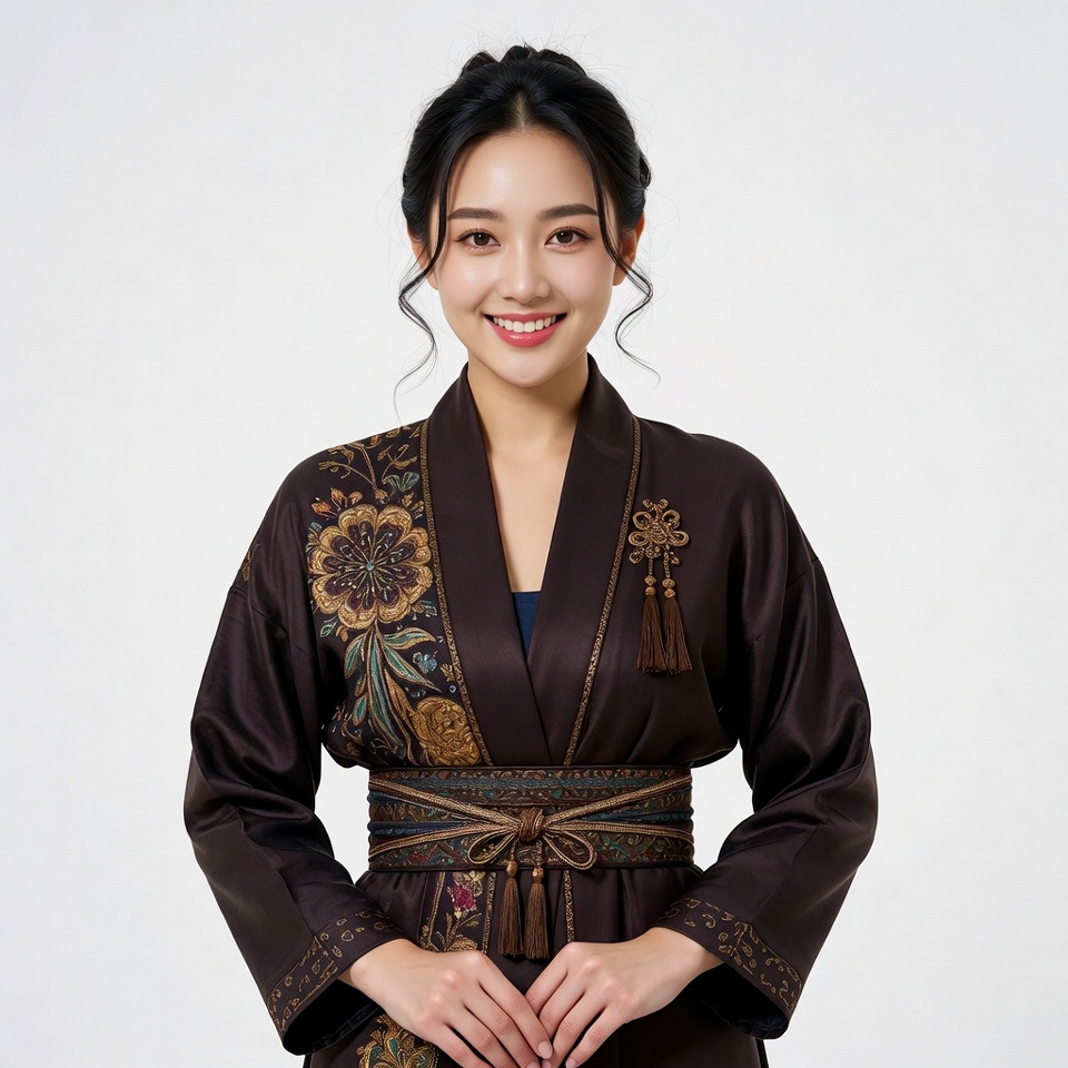 A young Asian woman with black hair styled in an updo smiles warmly at the camera. She wears a dark brown kimono featuring intricate floral embroidery in gold and colorful threads, accented with tassels and a wide obi belt. She stands with hands clasped in front on a plain white background.