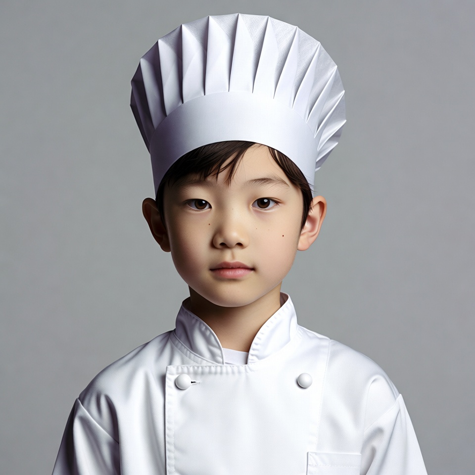 Asian, Asian boy, chef hat, chef outfit, chef uniform, child, cooking hat, gray background, kitchen uniform, male, neutral expression, portrait, short hair, toque, white jacket, young boy, boy