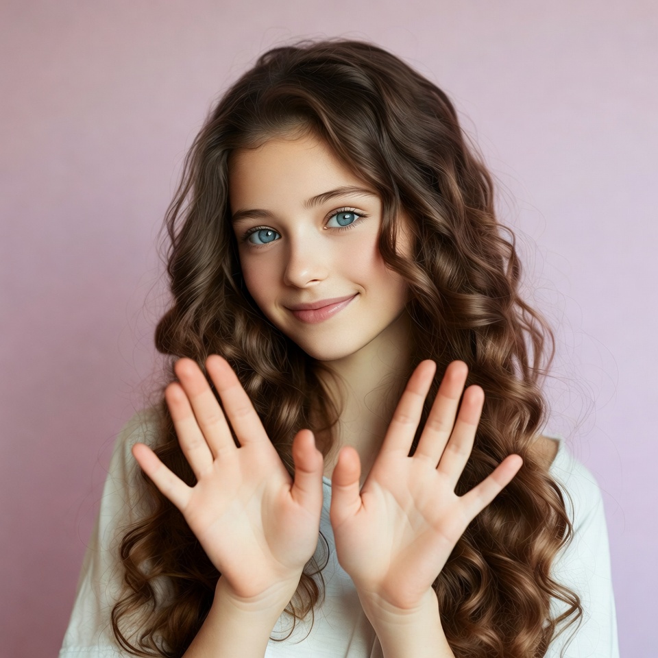 A young girl with long wavy brown hair and blue eyes stands against a pink background. She wears a white top and holds both hands up with palms facing forward in a waving gesture. Her expression is a gentle smile.