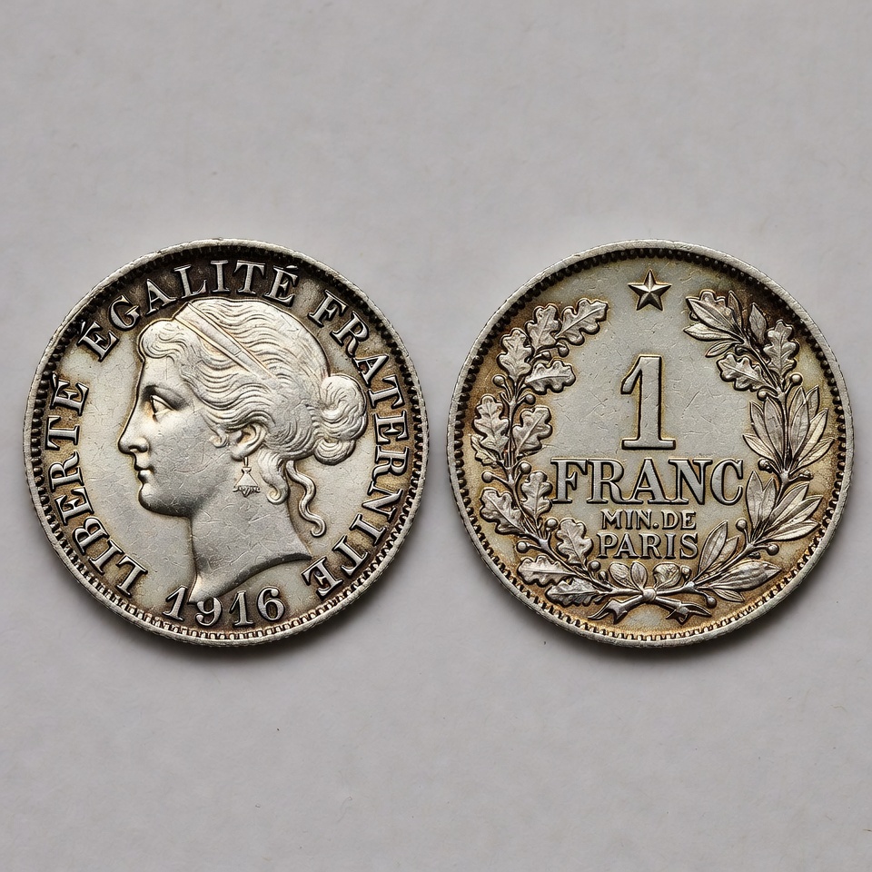 1 franc, 1916 coin, French franc, Marianne, Paris mint, Phrygian cap, coin collecting, currency, historical coin, laurel wreath, liberty equality fraternity, numismatics, oak leaves, obverse, reverse, silver coin, woman profile, French coin