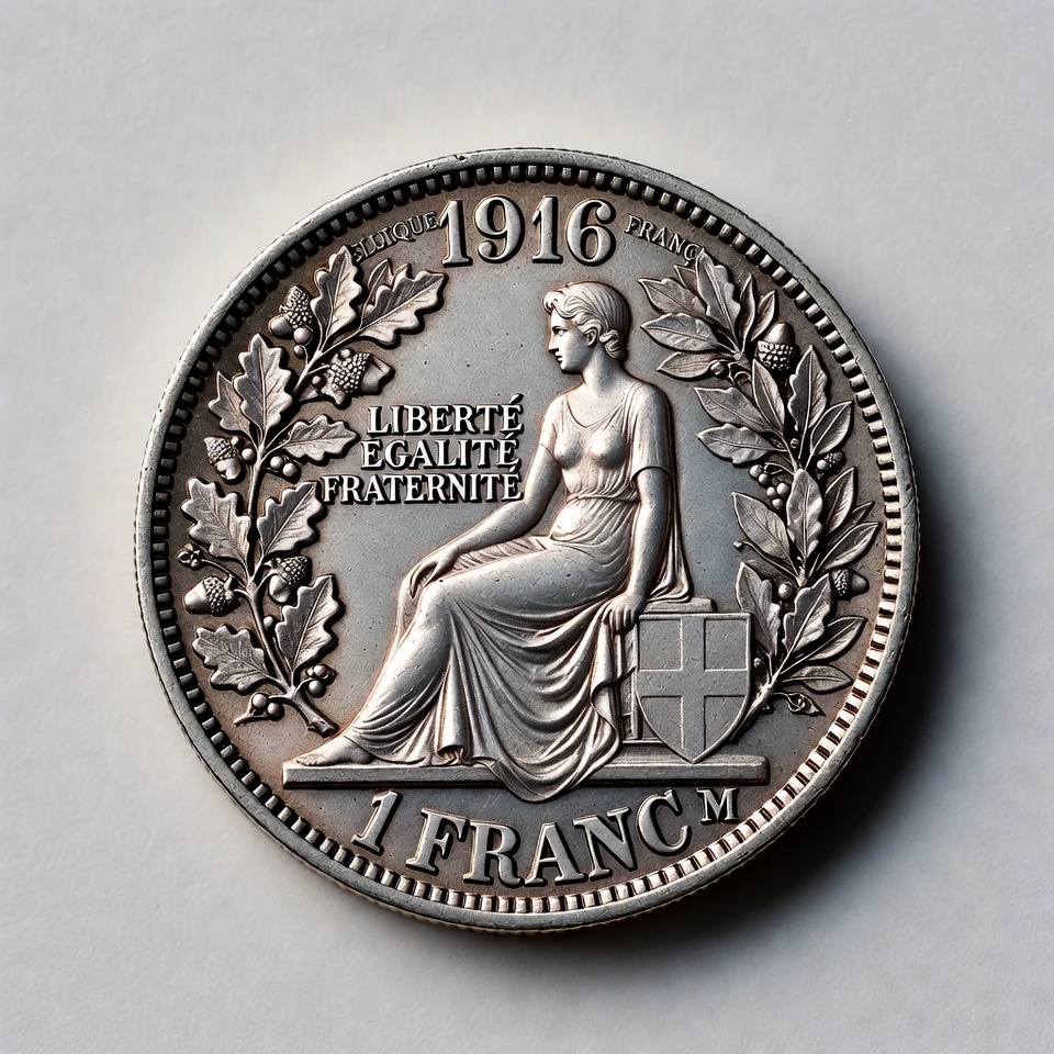 1 franc, 1916, French Republic, Marianne, Republic woman, berries, coin obverse, cross shield, currency, draped gown, female, historical coin, illustration, isolated background, liberty equality fraternity, numismatics, oak leaves, seated woman, shield emblem, silver coin, French coin