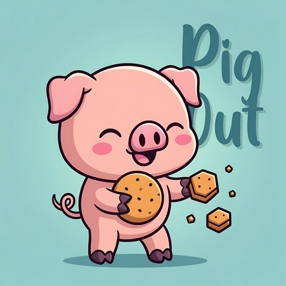 A chibi-style pink pig with happy eyes and a big smile holds a large orange cookie in its hooves. Smaller cookie pieces float around it on a light blue background. Bold white text 'Pig Out' appears above the adorable cartoon pig.