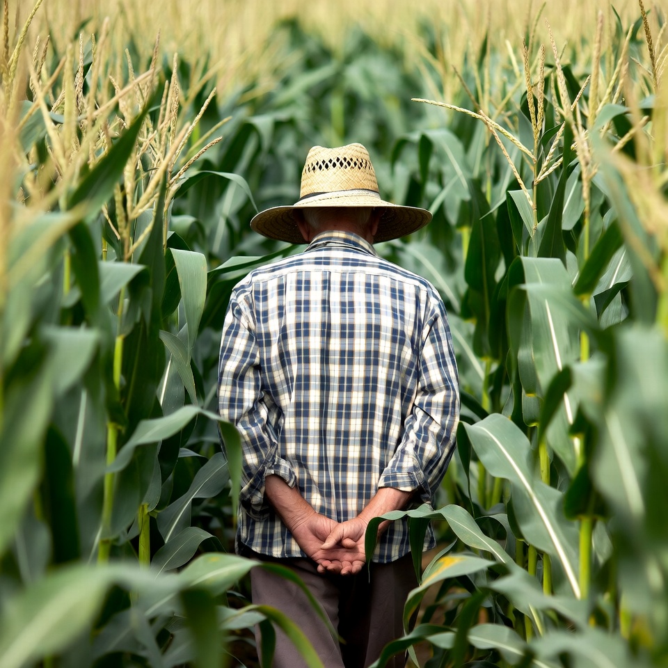 White, agriculture, back view, corn field, crop, farming, field, golden corn, green corn, hands clasped, harvest, maize, male, man, outdoor, plaid shirt, plants, rows, rural, straw hat, summer, tall stalks, walking, farmer