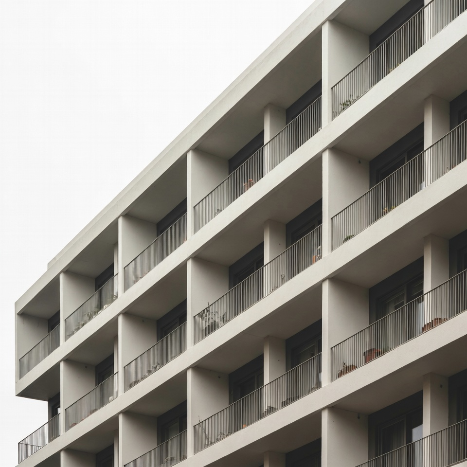 balconies, concrete slabs, exterior, greenery, high-rise, isolated background, metal railings, minimalist design, modern architecture, multi-story, potted plants, railings, urban building, white facade, apartment building