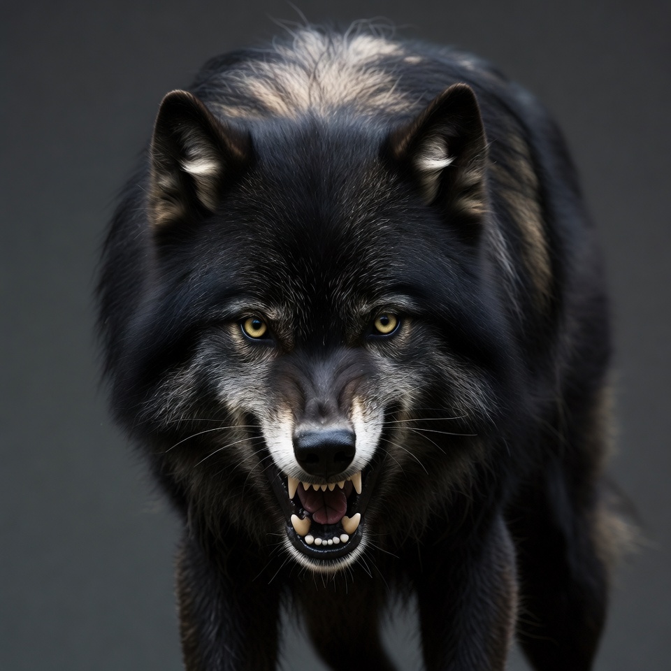 Growling Black Wolf with Bared Teeth