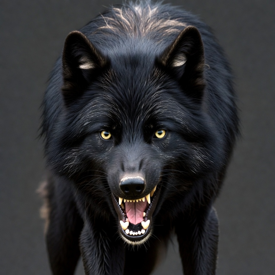 aggressive pose, animal, canine, dark background, dark fur, fierce wolf, glossy fur, growling wolf, predator, sharp fangs, snarling wolf, wild animal, wildlife, wolf, yellow eyes, black wolf