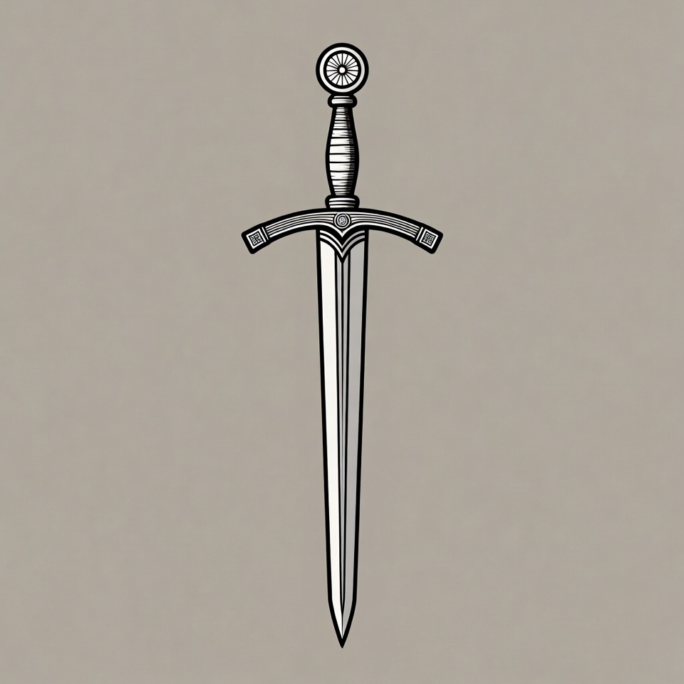 A detailed black line art illustration of a medieval sword with an ornate hilt. The sword features a crossguard with intricate designs, a round pommel, and a long straight blade. It is centered on a solid beige background.