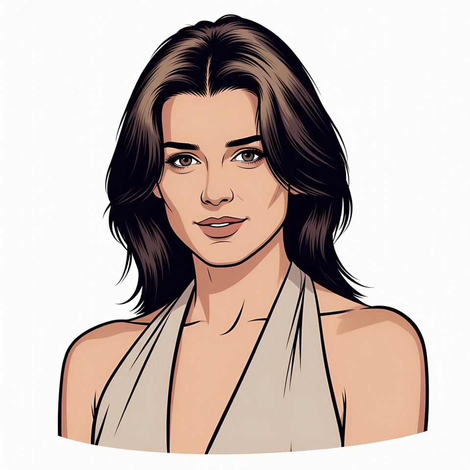 White, beautiful, brown hair, digital art, face, female, green eyes, halter top, illustration, isolated background, portrait, shoulders, smiling woman, vector art, wavy hair, white top, young woman, woman