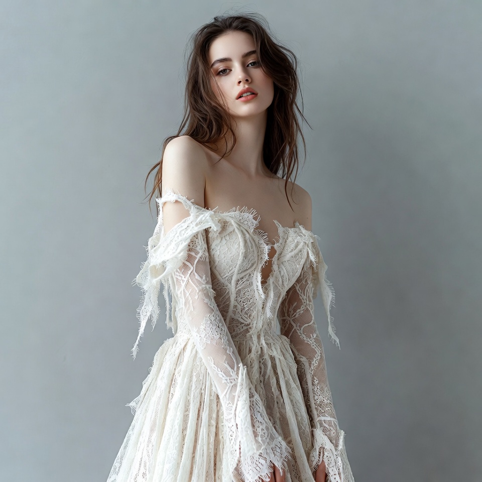 A young woman with long wavy brown hair poses elegantly against a gray background. She wears a detailed white lace gown with off-shoulder straps and intricate frayed edges. Her expression is soft and alluring as she stands gracefully.