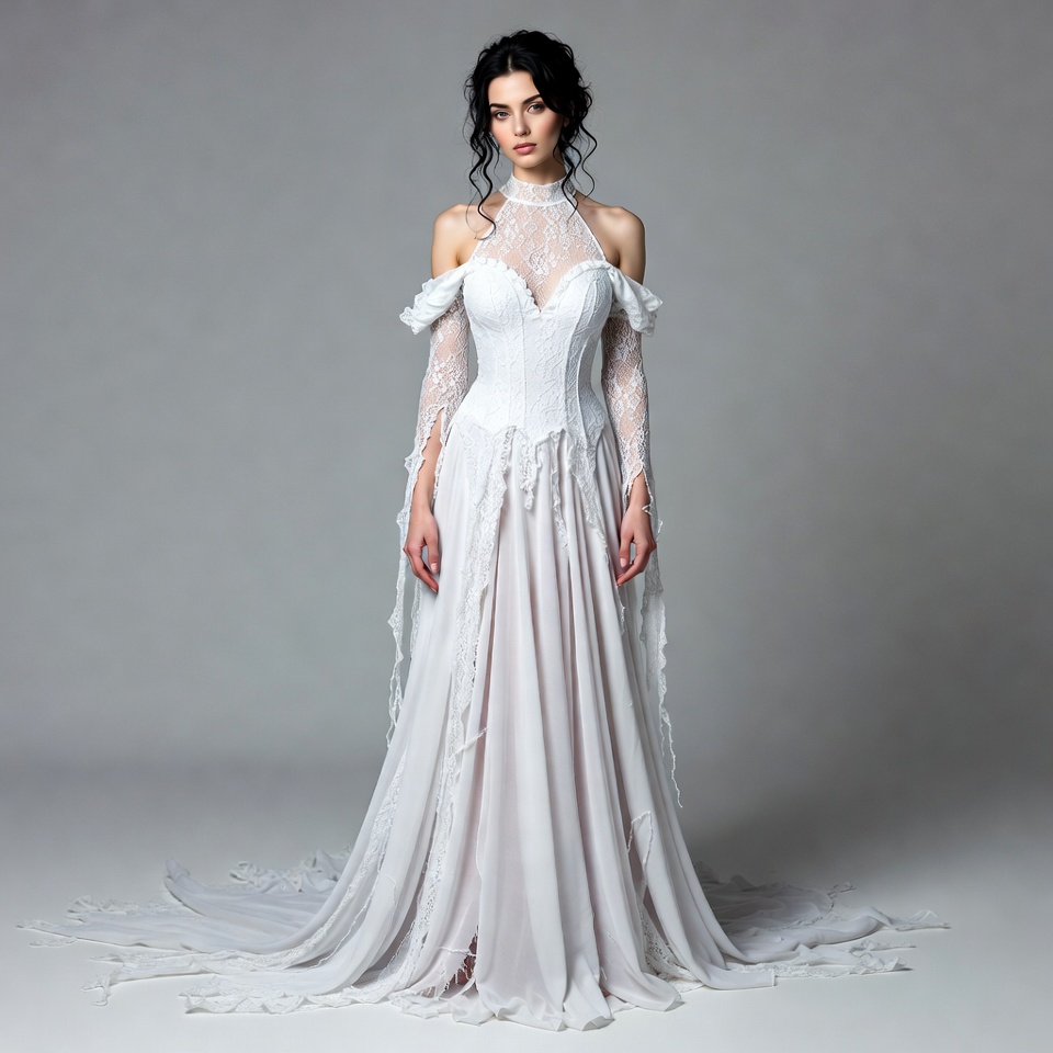 A woman with long dark curly hair stands gracefully wearing an off-shoulder white lace dress with a high neckline and long frilled sleeves. The flowing gown features intricate lace details and a long train spreading on the gray background. She poses with hands clasped in front, highlighting the dress's elegant design.