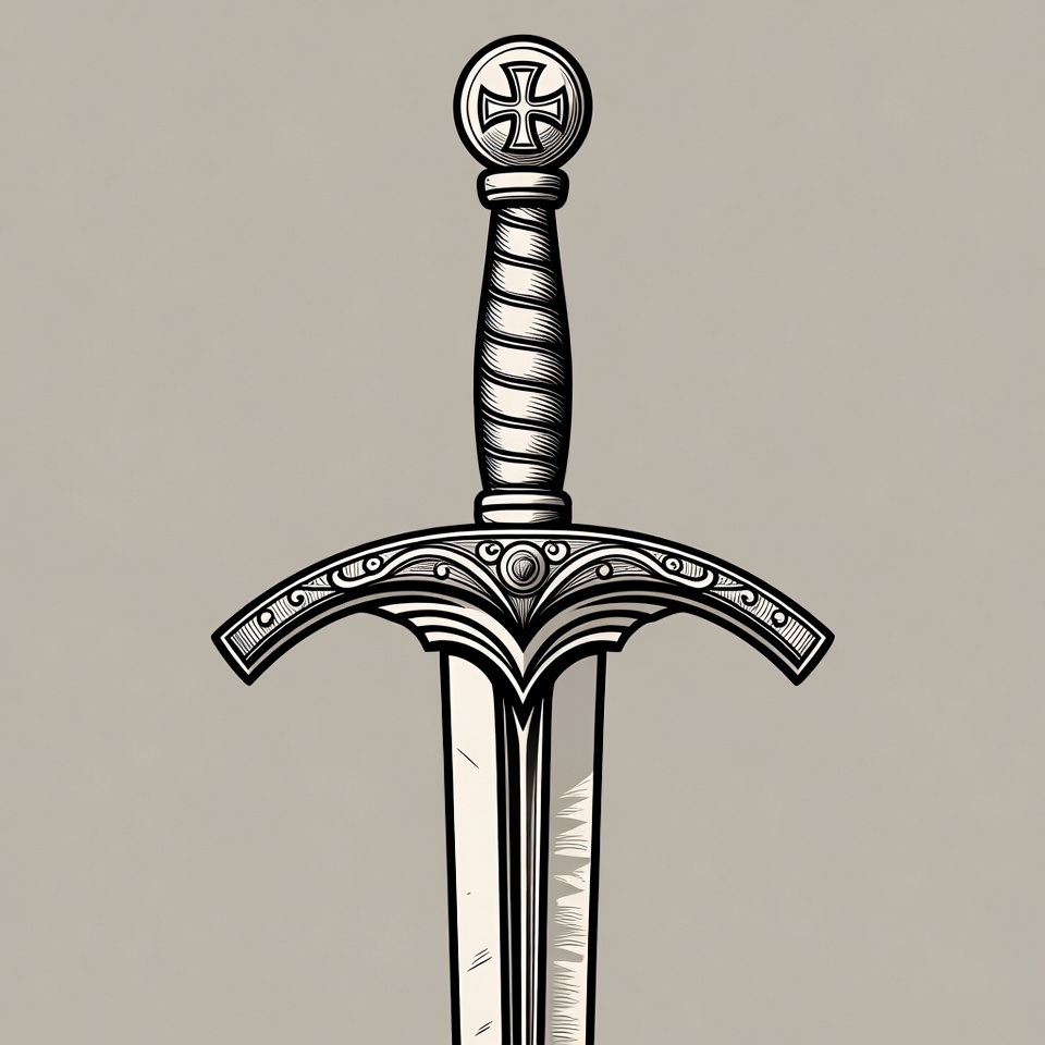 blade, clipart, cross pommel, engraved crossguard, fantasy sword, historical weapon, illustration, isolated background, knight sword, line art, medieval sword, ornate hilt, steel sword, weapon, sword