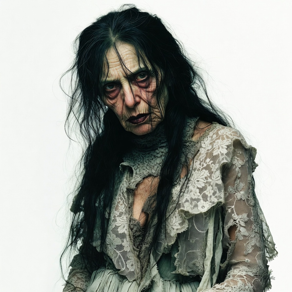 White, dark makeup, eerie face, female, gothic style, green dress, high collar, horror makeup, intense expression, isolated background, lace dress, long black hair, messy hair, pale skin, portrait, ragged clothing, tattered dress, white background, wrinkled skin, woman