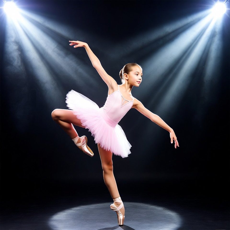 A young girl with light brown hair in a bun performs a ballet pose on stage under bright spotlights. She wears a pink leotard, white tutu, and pink pointe shoes, with one leg extended gracefully. Her arms are elegantly positioned as she balances on pointe against a dark background.