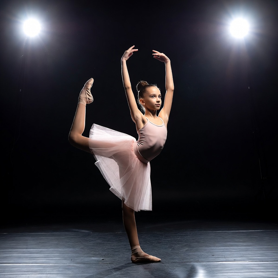 A young girl with her hair in a bun performs an arabesque ballet pose on a dark stage. She wears a pink tutu, leotard, and pointe shoes, with one leg extended high behind her and arms gracefully raised. Bright spotlights illuminate her from both sides against the black background.