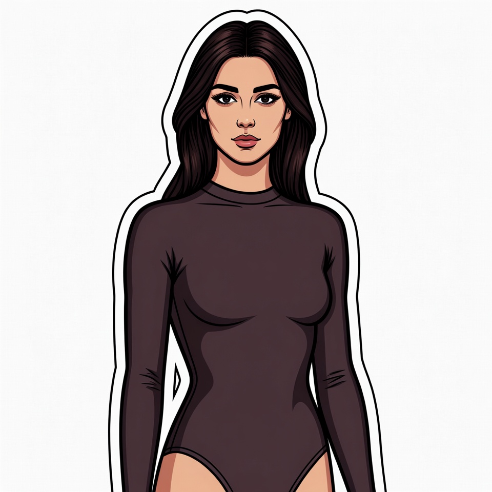 A cartoon illustration of a woman with long dark hair and tan skin stands on a white isolated background. She wears a form-fitting maroon long-sleeve bodysuit that accentuates her figure. The image features a bold black outline typical of clipart style.