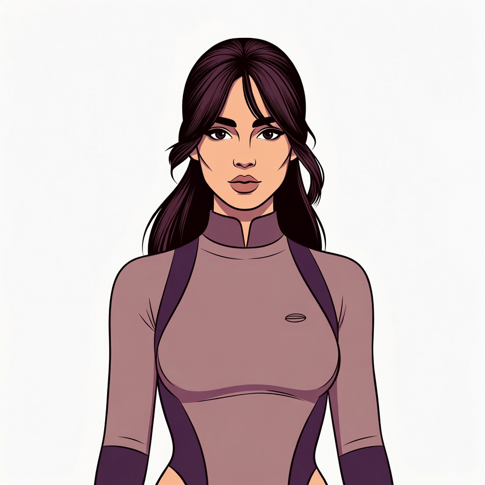 A detailed digital illustration of a young woman with long wavy dark brown hair and tan skin faces forward on a white background. She wears a form-fitting gray and purple futuristic bodysuit with a high collar and cutouts. Her expression is confident with subtle makeup.