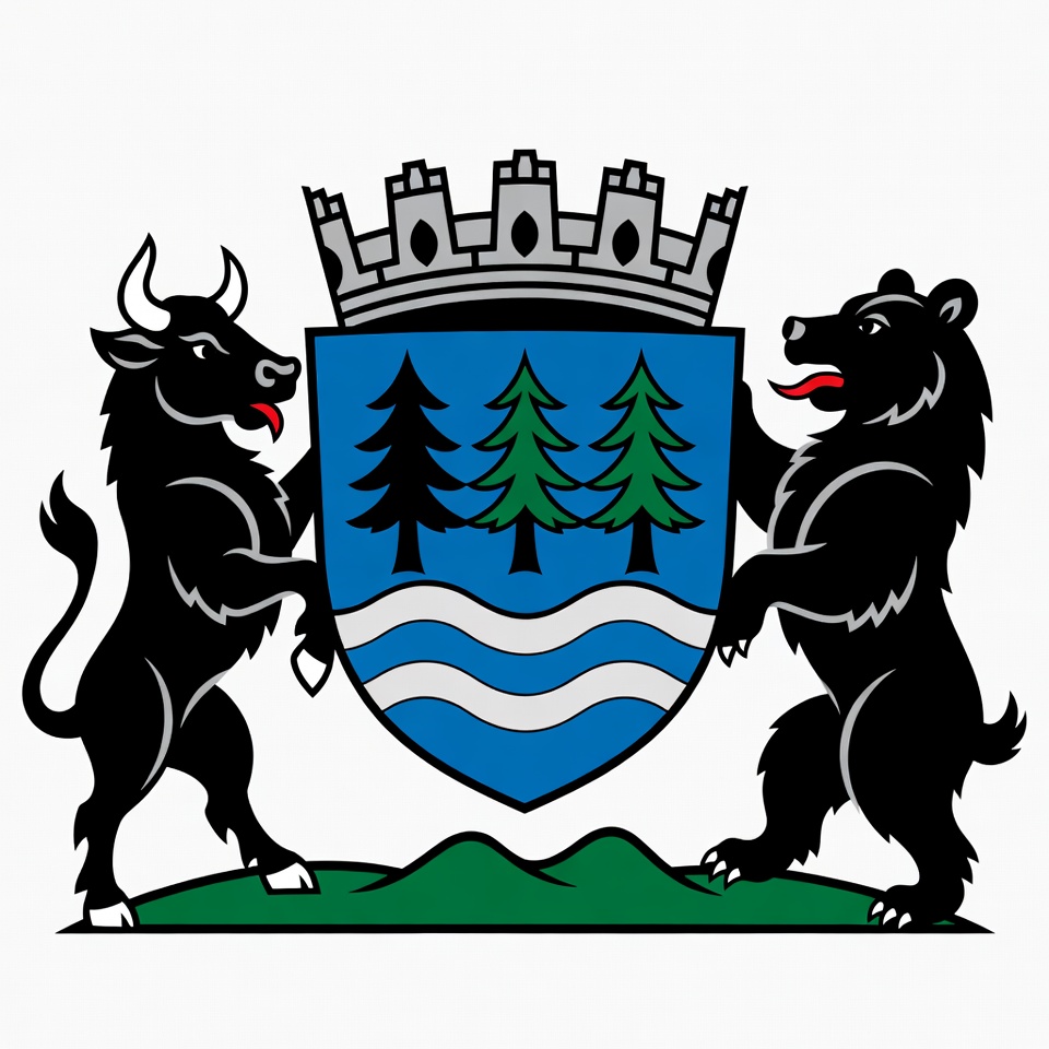 animals, bears, black bears, black bull, blue shield, bull, castle turret, crest, emblem, fir trees, green mound, green trees, heraldry, illustration, isolated background, mural crown, shield, symbol, vector, wavy water, coat of arms