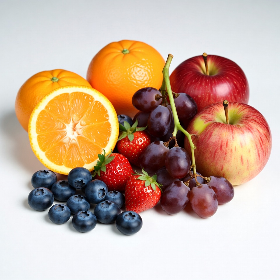 apples, berries, blueberries, citrus fruits, colorful fruits, food photography, fresh fruits, fruit arrangement, fruit bowl, grapes, healthy fruits, isolated fruits, juicy fruits, mixed fruits, oranges, produce, red apples, red grapes, ripe fruits, sliced orange, strawberries, white background, fruits