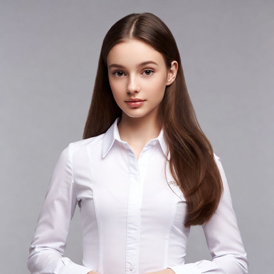A young woman with long straight brown hair stands against a gray background. She wears a white collared shirt with the top buttons undone and gazes directly at the camera. Her expression is neutral with subtle makeup.