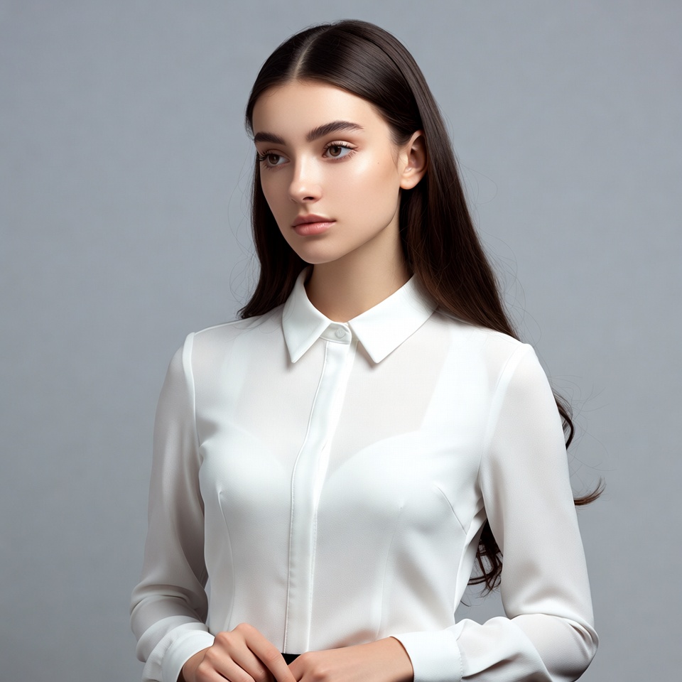A young woman with long straight dark brown hair stands against a plain gray background. She wears a sheer white collared blouse with long sleeves and has hands clasped in front. Her face shows subtle makeup with defined eyes and lips.