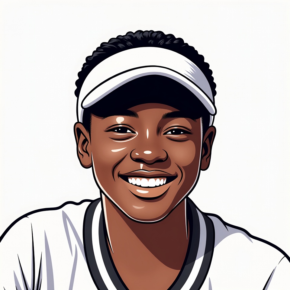 A cartoon illustration of a young African-American boy with short curly black hair smiles happily at the viewer. He wears a white visor cap and a white athletic shirt with black trim. The image is isolated on a plain white background.