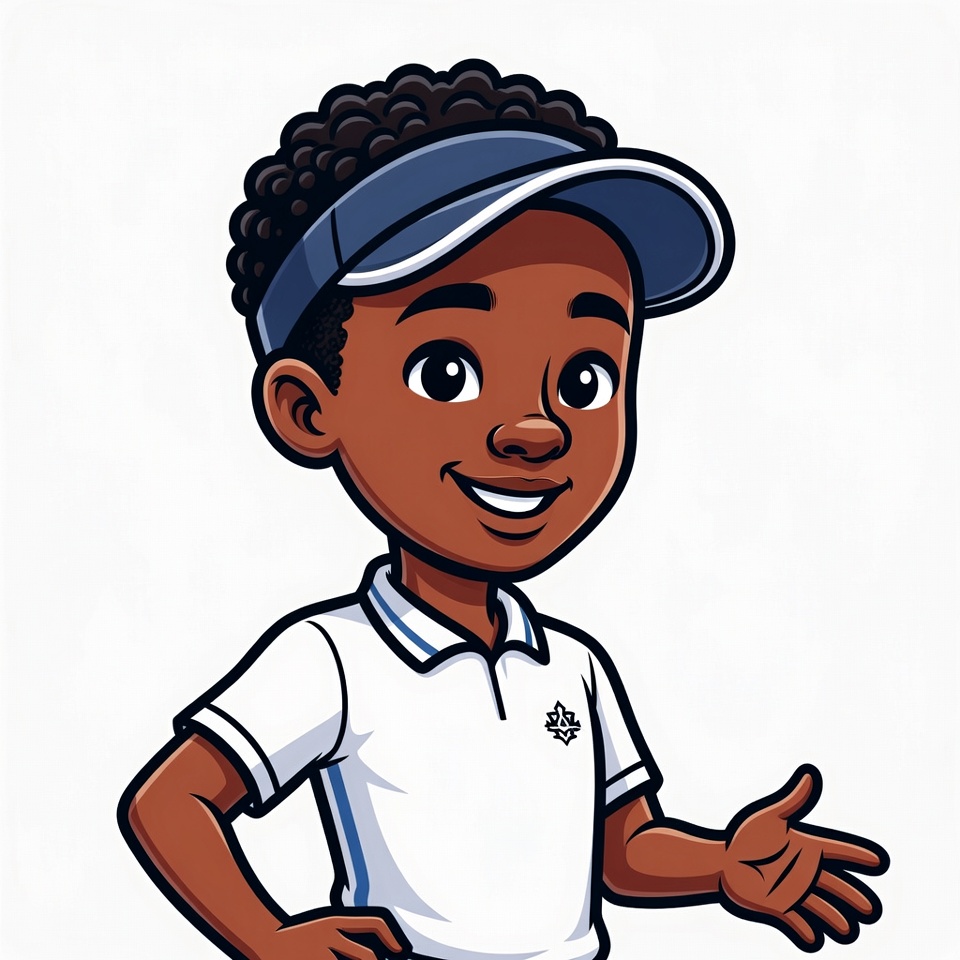 A cartoon illustration of a young Black boy with curly hair smiles happily while wearing a blue visor and white polo shirt with a logo. He stands with one hand on his hip and the other extended outward on an isolated white background. His large expressive eyes and cheerful expression are prominent.