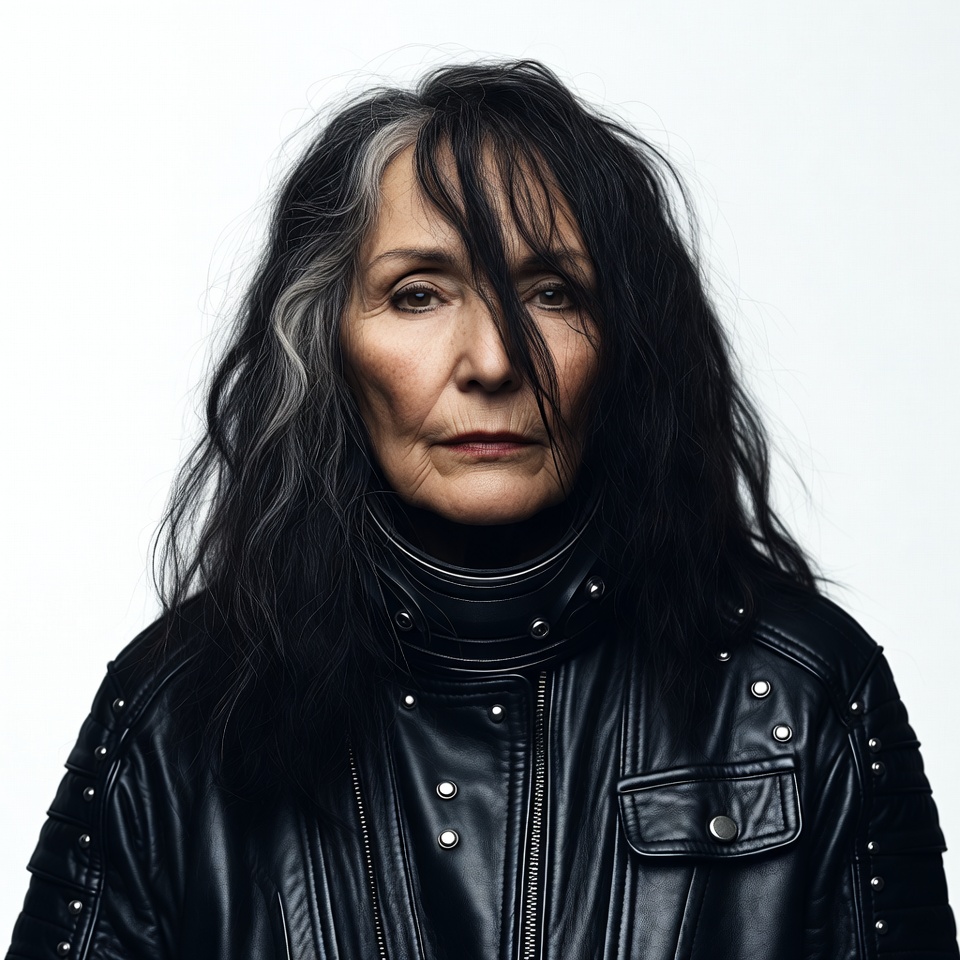 White, black hair, black jacket, closeup, female, fringe, gray hair, headshot, high collar, leather jacket, mature woman, portrait, serious expression, studs, wavy hair, white background, woman