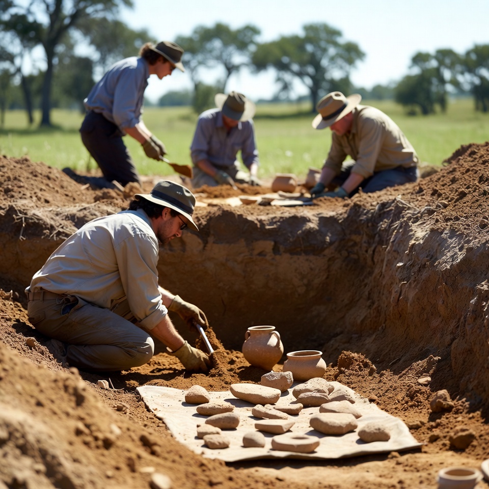Several men wearing hats and work clothes dig in a sandy archaeological excavation site surrounded by grassy fields and trees. They use tools to uncover pottery shards and intact vessels displayed on a tarp. The scene shows active fieldwork with earth mounds and ancient finds.
