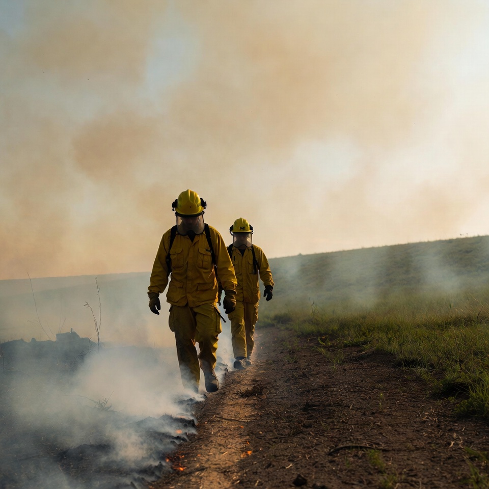Two firefighters in yellow protective suits and helmets walk along a dirt path through a grassy field during a wildfire. Thick smoke and flames rise from burning vegetation nearby, with a hazy sky overhead. They carry gear and move forward amid the smoky terrain.