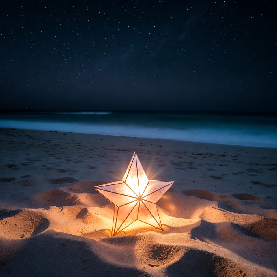 A glowing star-shaped paper lantern sits on sandy beach at night, illuminated against a starry sky. Gentle waves lap at the shore in the background under a dark, star-filled sky. The lantern's warm light contrasts with the cool blue tones of the ocean and night sky.