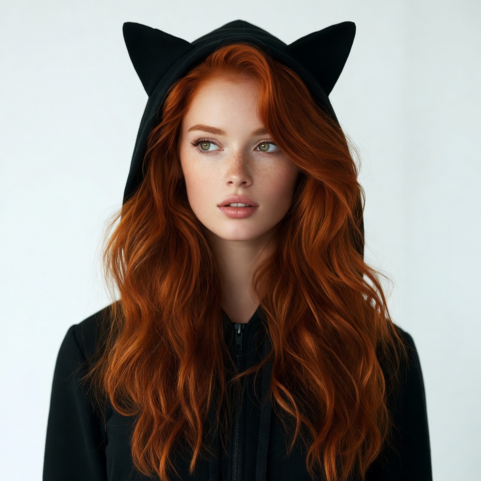 A young woman with long wavy red hair and freckles wears a black hoodie with black cat ears. She has green eyes and a subtle smile, gazing slightly to the side. The image features an isolated white background.