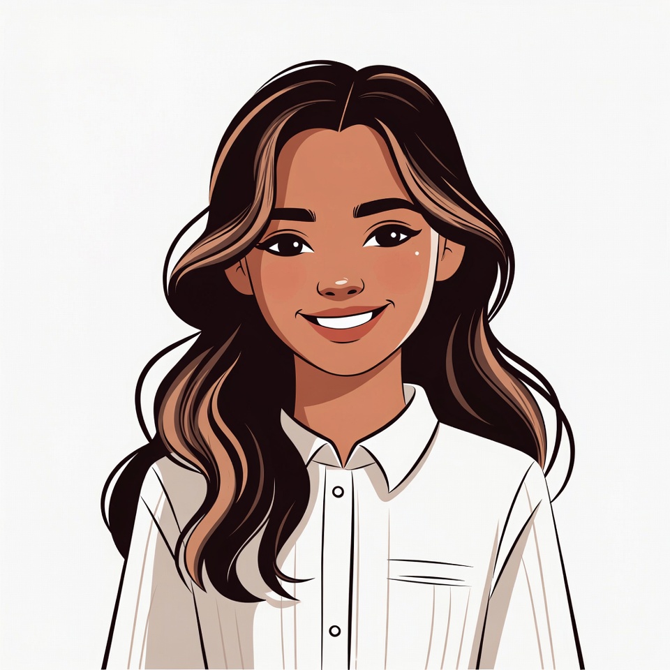 Asian, beautiful, cartoon, cheerful, collared shirt, dark hair, drawing, face, female, headshot, highlighted hair, illustration, isolated background, long hair, portrait, smiling, wavy hair, white shirt, young woman, woman