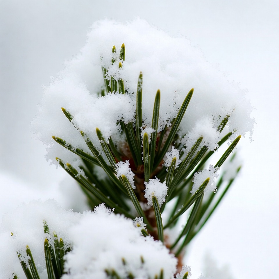 A close-up view of a pine tree branch blanketed in fresh white snow. The green needles peek through thick layers of snow, with a soft blurred background. Snow clings to each needle tip.