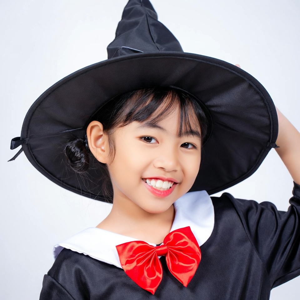 Asian child, Asian girl, Halloween, Halloween witch, black dress, black hat, child, costume, female, happy face, isolated background, kid, pointed hat, red bow, smiling girl, white collar, wide brim hat, witch costume, witch hat, young girl, girl
