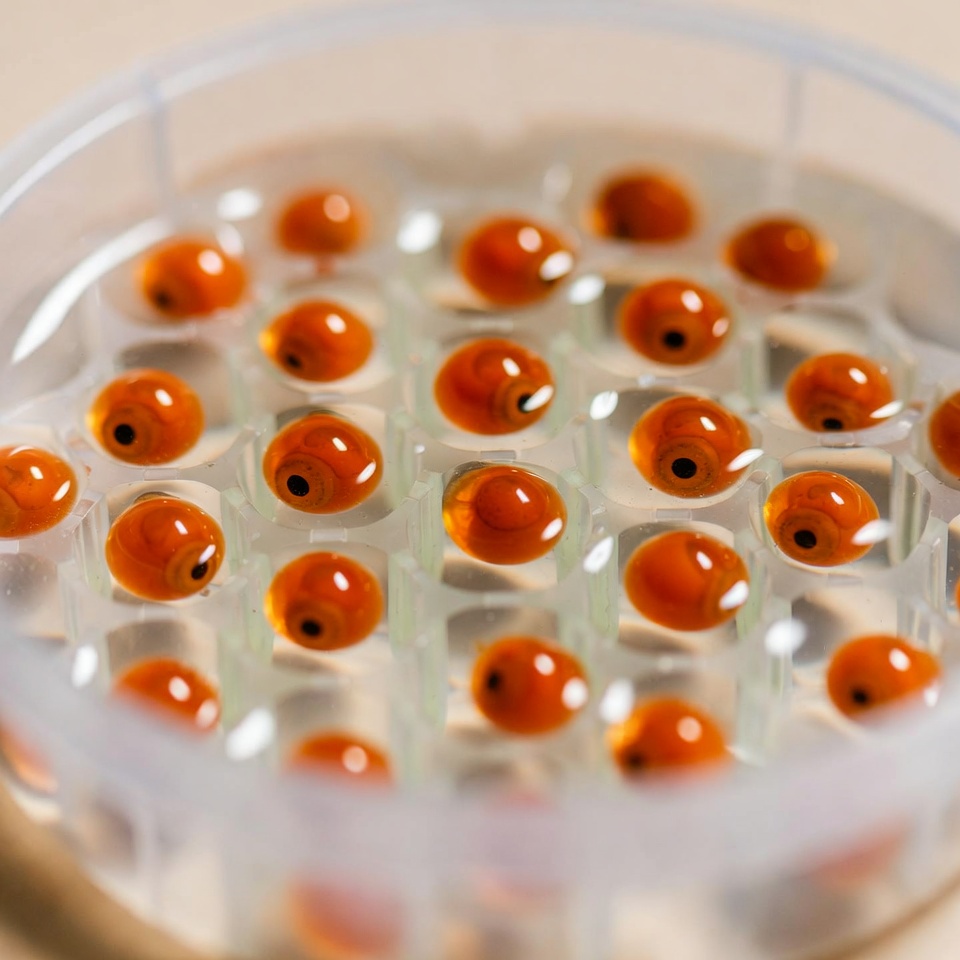 aquaculture, biology, caviar, closeup, egg cluster, embryo, gel base, lab, marine biology, microscope, orange eggs, petri dish, roe, science, scientific sample, translucent eggs, transparent dish, fish eggs