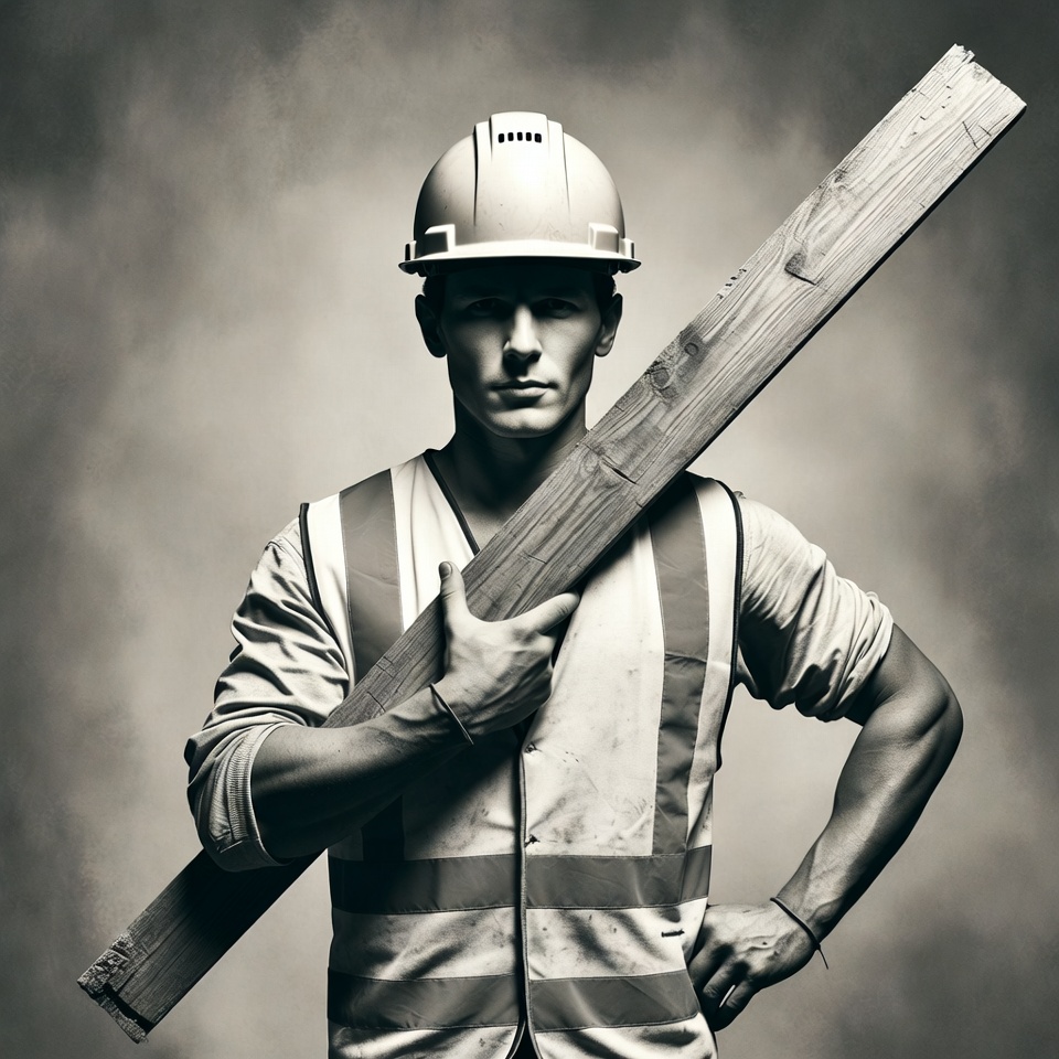 A man wearing a white hard hat and high-visibility vest stands confidently with a large wooden beam held across his chest. He has a serious expression and gloved hands gripping the timber firmly. The image is in black and white against a blurred gray background.