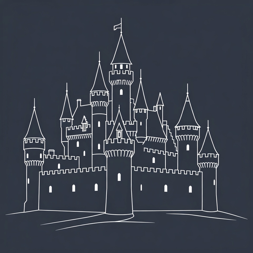 A detailed line drawing of a majestic castle with multiple towers and turrets on a dark background. The illustration features white outlines against navy, including a flag atop the highest spire and fortified walls with windows. It is a clipart-style drawing isolated on a solid background.