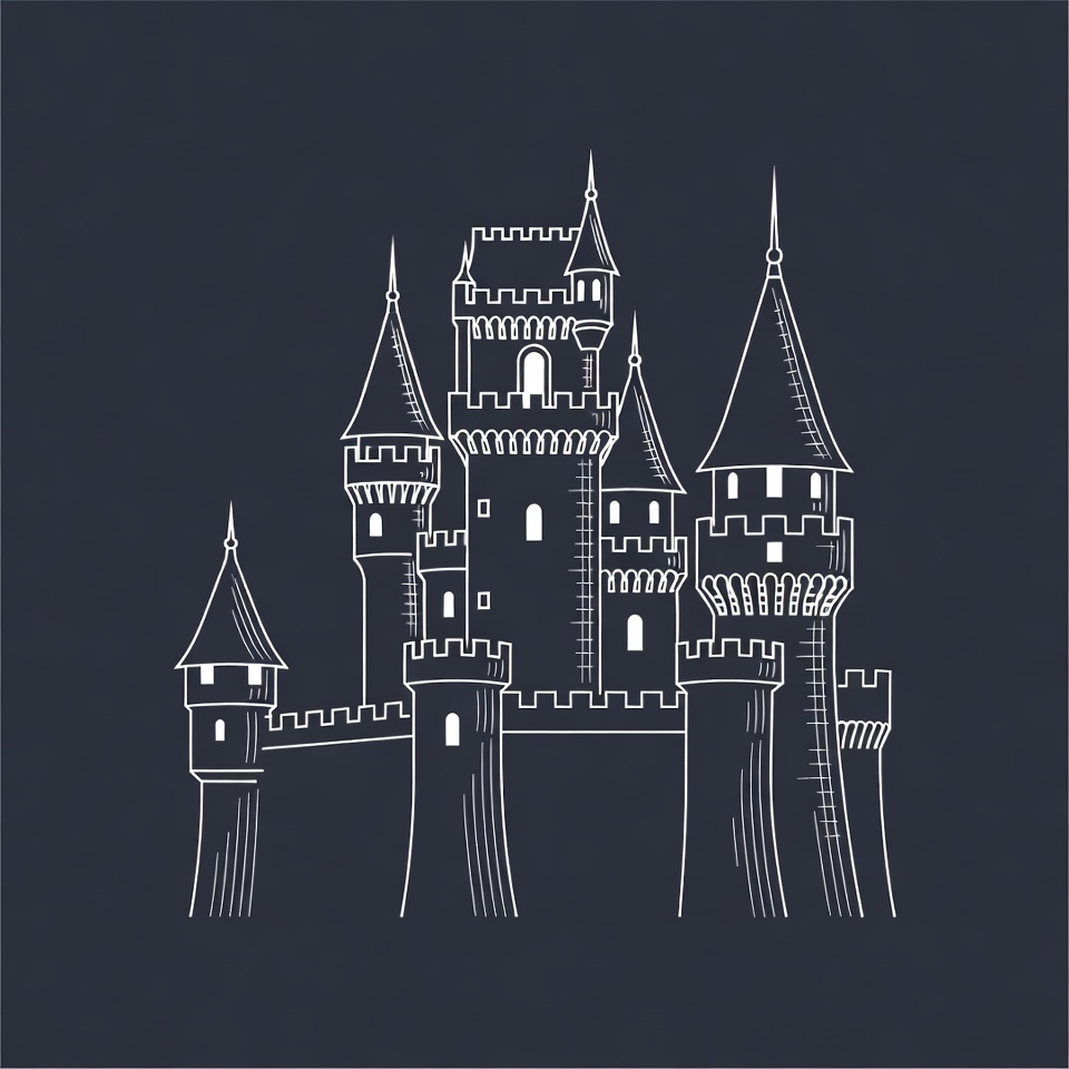 A detailed line drawing of a medieval castle with multiple tall towers and spires. The castle features arched windows, battlements, and a connecting walkway. It is rendered in white outlines on a dark navy background.