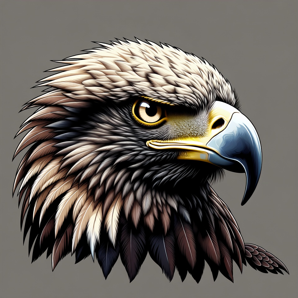 A detailed illustration of a bald eagle's head with intricate feathers in shades of brown, white, and gold. The eagle features a sharp yellow beak and intense yellow eyes with a fierce gaze. It is set against a solid gray background.