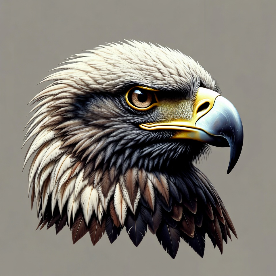 A detailed closeup of a bald eagle's head features sharp yellow beak and intense yellow eyes. The feathers are white on the head with dark brown on the neck, rendered in a realistic digital illustration style. It is set against a plain gray background.