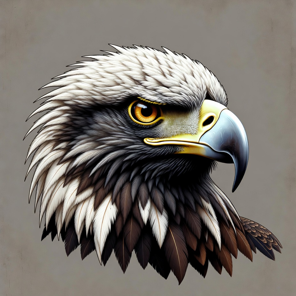 A detailed illustration of a bald eagle's head with white feathers on the head and neck contrasting against dark body feathers. The eagle features a sharp yellow beak and intense yellow eyes with a fierce expression. It is set against a textured gray background.
