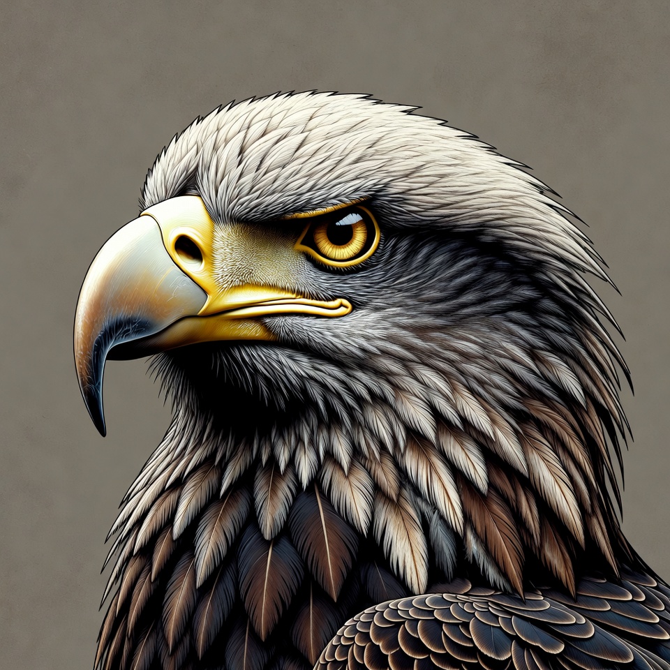 A detailed close-up portrait of a bald eagle with white feathers on its head and neck, dark brown body feathers, a large yellow beak, and intense yellow eyes. The eagle faces slightly to the side against a solid gray background. The feathers are rendered with realistic texture and lighting.