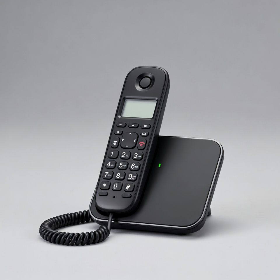 black phone, buttons, cordless cord, desk phone, digital display, home phone, isolated background, keypad, landline, phone base, phone handset, product photo, telephone, corded phone