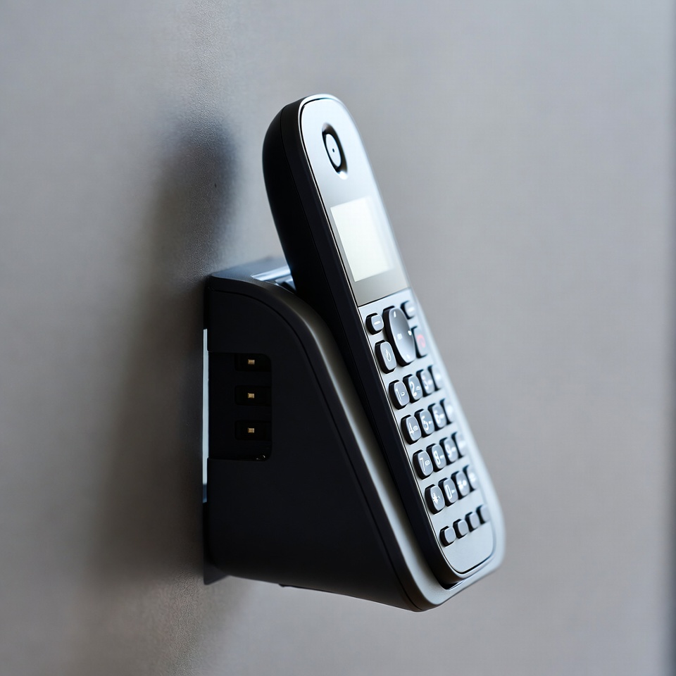 black phone, communication device, cradle, desk phone, digital display, gray wall, home phone, isolated background, keypad, mounted phone, phone, telephone, wall mount, wireless phone, cordless phone