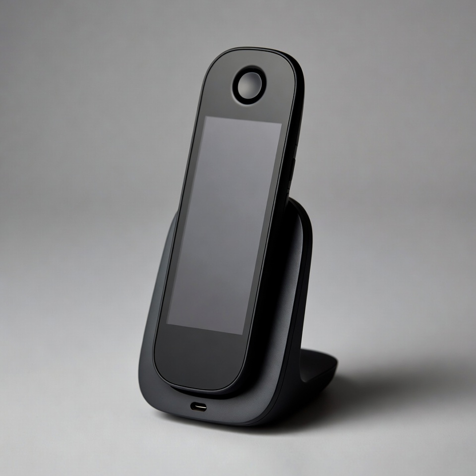 DECT phone, USB-C, black phone, charger, charging stand, device, display, dock, gadget, home phone, isolated background, modern phone, phone, screen, technology, telephone, wireless phone, cordless phone