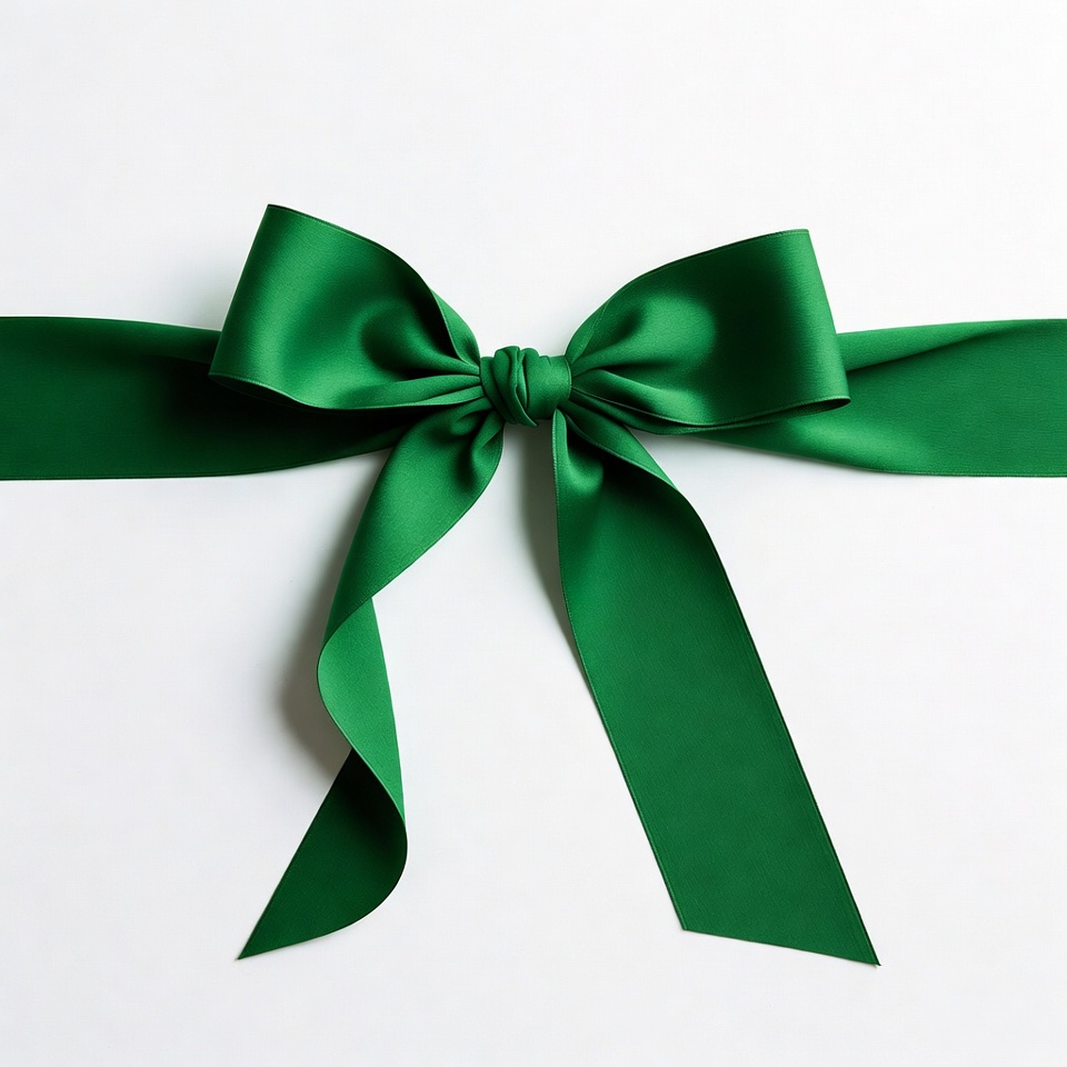 A large green satin ribbon forms an elegant bow with long trailing ends. The glossy material shines under light, centered on a plain white background. The bow is tied neatly with symmetrical loops.