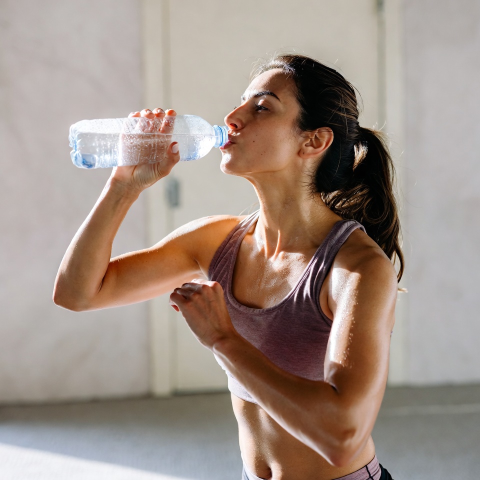A fit woman with dark hair in a ponytail drinks from a clear plastic water bottle. She wears a purple sports bra and stands in a sunlit room with a white door in the background. Her arm is extended as she tilts her head back to sip.