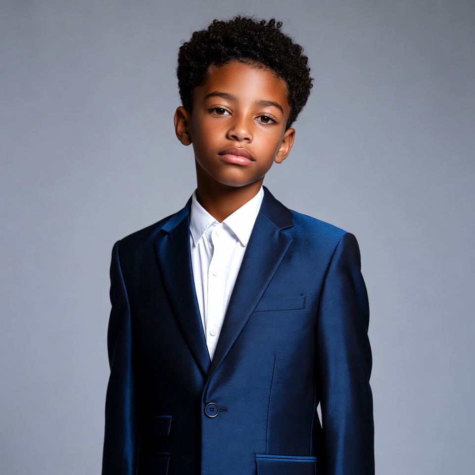A young African-American boy with curly black hair stands confidently wearing a shiny navy blue suit jacket and white dress shirt. He has a serious expression on his face and is posed against a plain gray background. The suit features a notched lapel and button details.