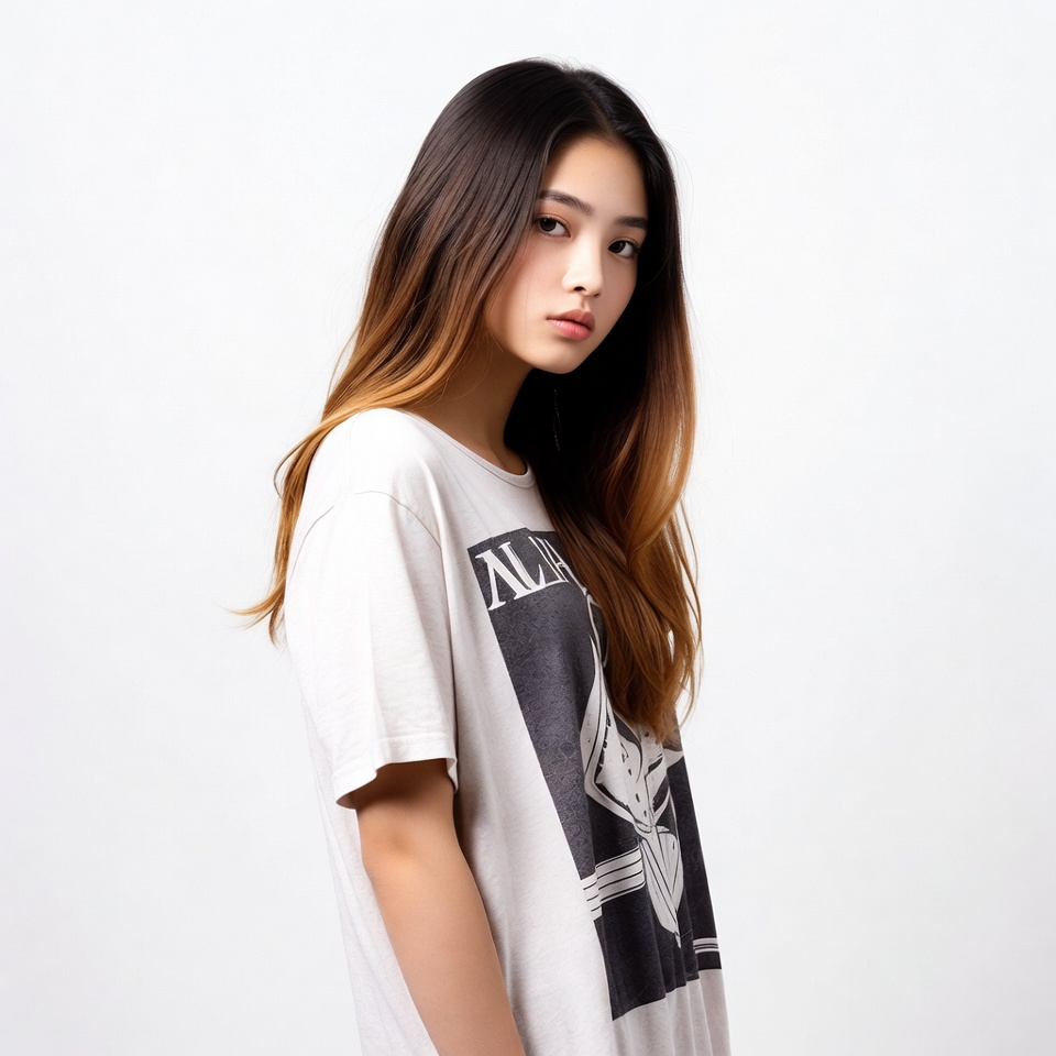 A young Asian woman with long straight black hair highlighted with brown tips stands in profile view against a white background. She wears a loose-fitting white oversized t-shirt featuring a black graphic print on the front. Her expression is neutral with slightly pursed lips, and she poses casually with one arm relaxed.